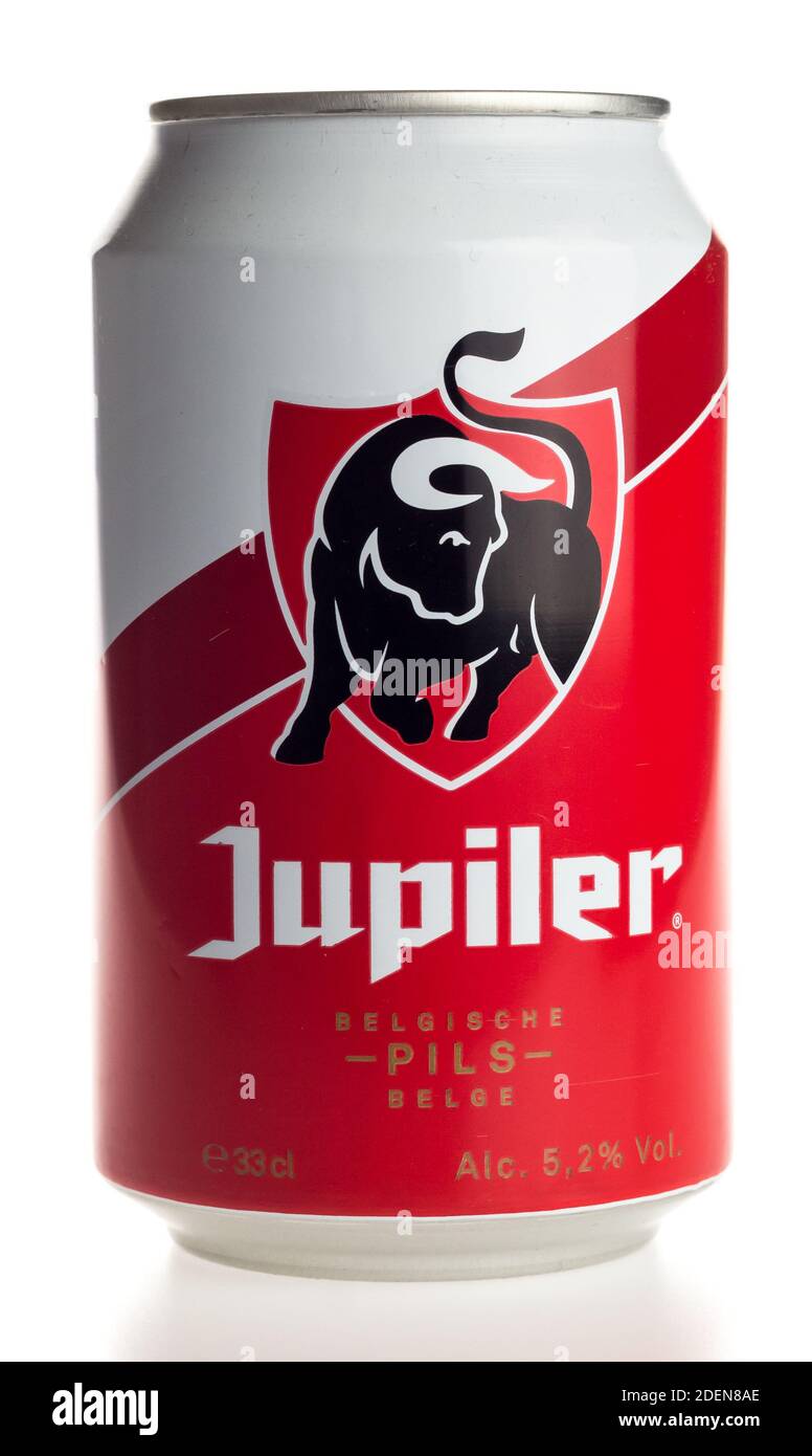 Dose Belgisches Jupiler Bier Isoliert Auf Weissem Hintergrund Stockfotografie Alamy
